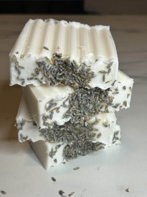Ingredients: Purified Water, Raw Shea Butter, Coconut Oil, Safflower Oil, Glycerine (kosher), Calendula Flowers, Sodium Hydroxide (saponifying agent, Sorbitol (moisturizer), Sorbitan oleate (emulsifier), Oat Protein, Titanium Dioxide, Rose Geranium, Lavender essential oil, Chamomile, Calendula and Lavender buds.